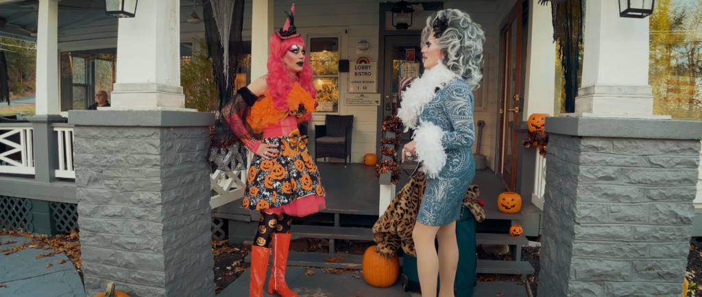 But the villain can also be cause for celebration, as is the case in Halloween Headliners, the 14-minute short film directed and written by Chris Carter and John Simpson. The film follows longtime drag rivals Elvirus and Betty Whitecastle as they co-headline a Halloween show at a creepy, remote gay campground.